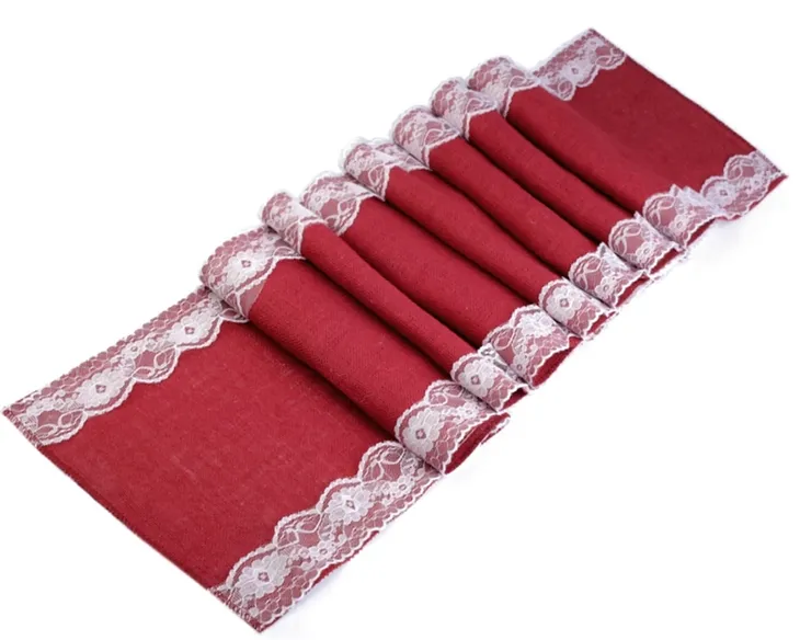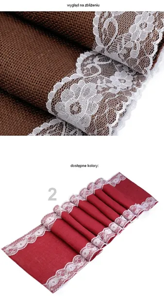 Bieżnik z kolorowej juty jest na brzegach ozdobiony klasyczną koronką w kwiaty.