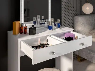 Ma odpowiednio duży blat oraz dwie szuflady na kosmetyki, akcesoria czy też biżuterię. Posiada także lustro z pionowym oświetlenie w postaci listw LED, które są wmontowane w ramę. Ergonomiczny kształt oraz przemyślana konstrukcja daje możliwość wsunięcia pufy pod blat, a dzięki niedużym wymiarom można usytuować ją nawet w niewielkiej sypialni lub pokoju. Solidnie wykonana z dbałością o każdy detal, stabilna konstrukcja toaletki pozwali cieszyć nią przez wiele lat.