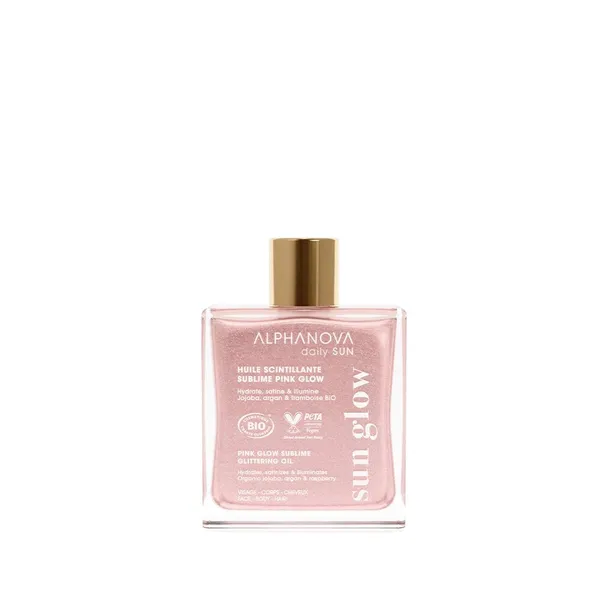 Bio Suchy Olejek z Drobinkami Pink Glow z serii Alphanova Daily Sun to lekki, suchy olejek, który intensywnie odżywia skórę, pozostawiając ją jedwabiście gładką i promienną. Dzięki organicznym olejom jojoba, arganowemu, kokosowemu oraz z maliny, doskonale regeneruje i nawilża skórę po dniu spędzonym na słońcu.