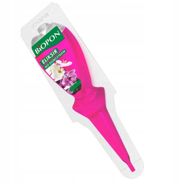 Biopon eliksir do storczyków 40 ml Innowacyjny preparat przeznaczony do zasilania wszystkich gatunków storczyków. Specjalnie dobrany skład eliksiru dba o piękny i zdrowy wygląd kwiatów oraz liści zasilanych roślin. Gotowa do użycia, porcjowana postać preparatu oraz samodozujący aplikator gwarantują łatwość i wygodę stosowania. Działanie eliksiru utrzymuje się aż do 4 tygodni. Sposób użycia: Stosować jeden aplikator na każdy zasilany storczyk, raz w miesiącu. Odłamać końcówkę aplikatora w zaznaczonym miejscu. Umieścić aplikator w podłożu tak, aby oba preparaty swobodnie z niego wypływały. W razie potrzeby można delikatnie ścisnąć aplikator, aby udrożnić jego wylot. Pozostawić aplikator w podłożu aż do jego całkowitego opróżnienia. Przy systematycznym podlewaniu eliksir będzie działał do 4 tygodni, mimo że preparat spłynie do podłoża dużo szybciej.