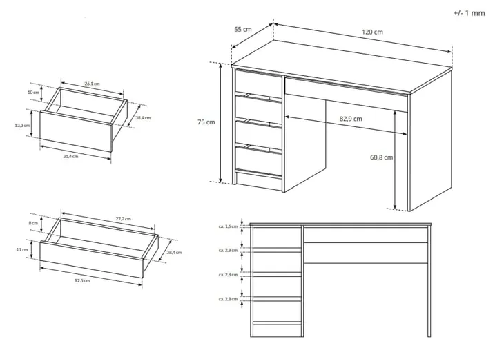 - biurko uniwersalne - strona szuflad ustalana jest przy montażu,