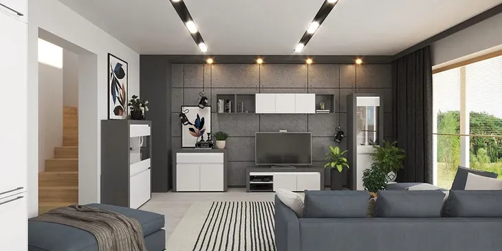 Meble z tej kolekcji są propozycją dla osób doceniających nowoczesny wygląd mebli. Korpusy i fronty wykonane są z matowej płyty laminowanej w kolorze grafitowo- białym. System ten idealnie nadaje się zarówno do salonu jak i pokoju młodzieżowego.