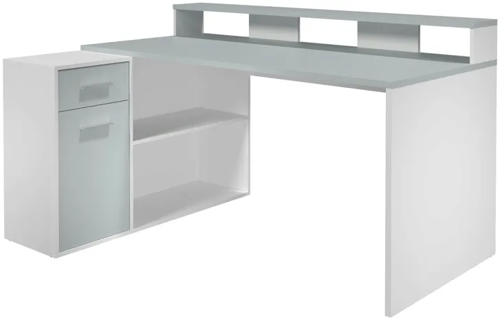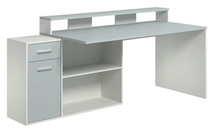 Biurko 1 drzwi, 1 szuflada. Wykonane zostało z płyty laminowanej w kolorze biały mat łączony z laminatem jasnoszary mat. Biurko przypadnie do gustu fanom nowoczesnego stylu. Świetnie sprawdzi się zarówno w nowoczesnym biurze, jak i w pokoju nastolatka.
