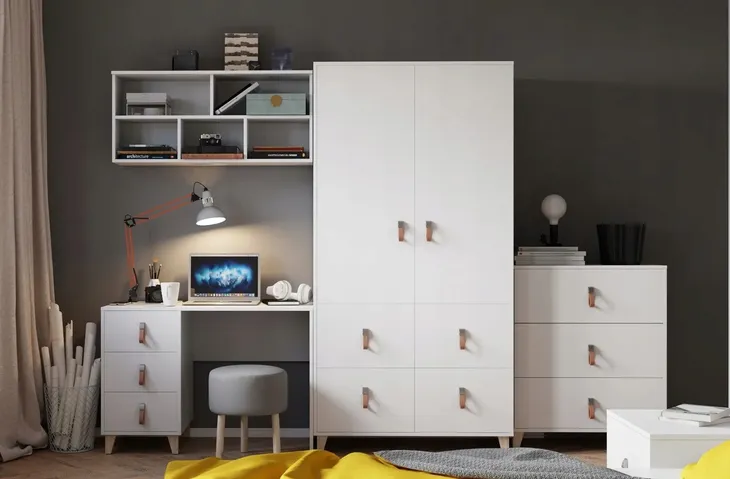 System mebli FIGO to wiele brył, dzięki czemu istnieje możliwość tworzeniu dowolnych zestawów, które możemy dopasować do potrzeb i wielkości pokoju dziecka. Stylistyka skandynawska, delikatne drewniane nogi. Skórzane nowoczesne uchwyty dodają uroku meblom. Krawędzie mebli zabezpieczone obrzeżem ABS. Doskonałe meble do pokoju dziecięcego lub młodzieżowego, jasna kolorystyka, nowoczesny skandynawski styl.