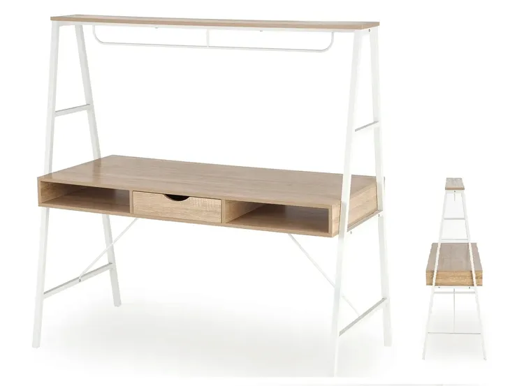 - Biurko posiada wytrzymały blat wykonany z płyty meblowej okleinowanej w kolorze dąb sonoma, dzięki czemu mebel zyskuje niezwykle urodziwy wygląd a przy tym jest solidny i trwały.