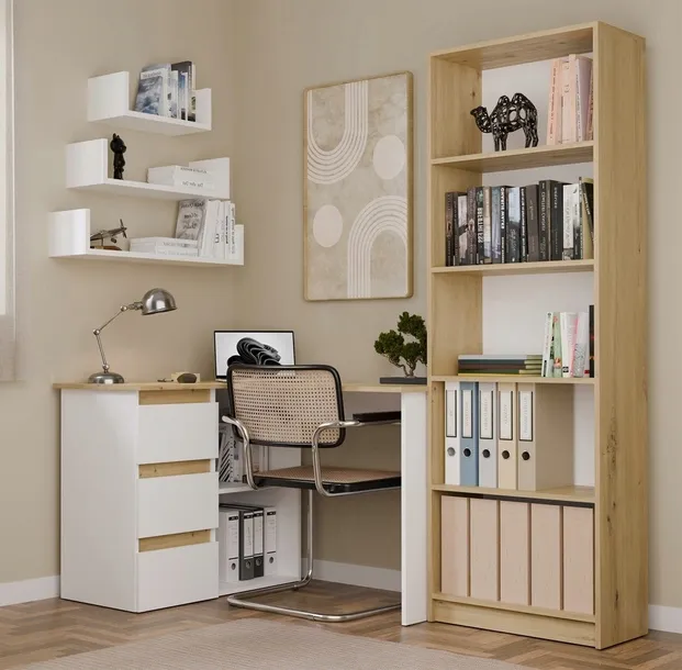 Biurko wyposażono w pojemne szuflady oraz otwarte półki, które ułatwiają organizację dokumentów i akcesoriów. Duży blat roboczy daje komfortową przestrzeń na komputer i codzienne zadania, a narożna konstrukcja pozwala maksymalnie wykorzystać dostępne miejsce.