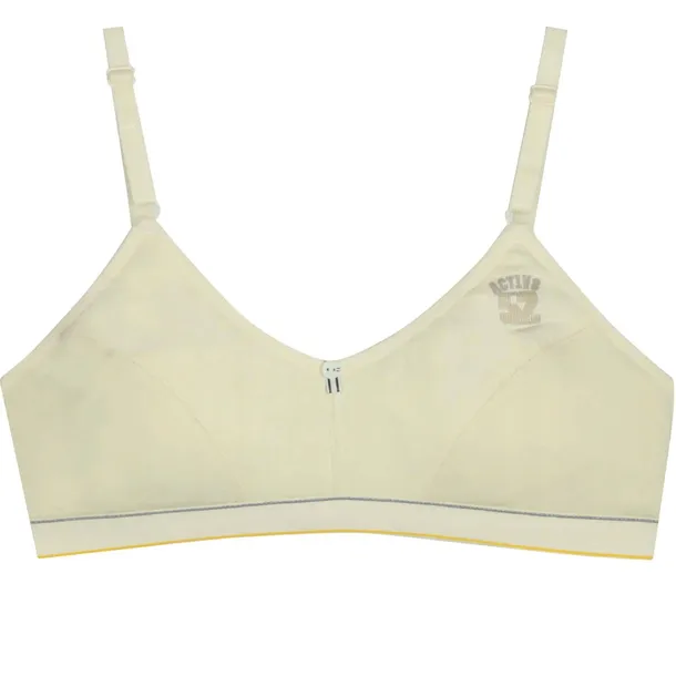 Śliczny stanik w kolorze jasnożółtym z niewielkim nadrukiem oraz guziczkiem przy dekolcie. Posiada delikatne przeszycia.