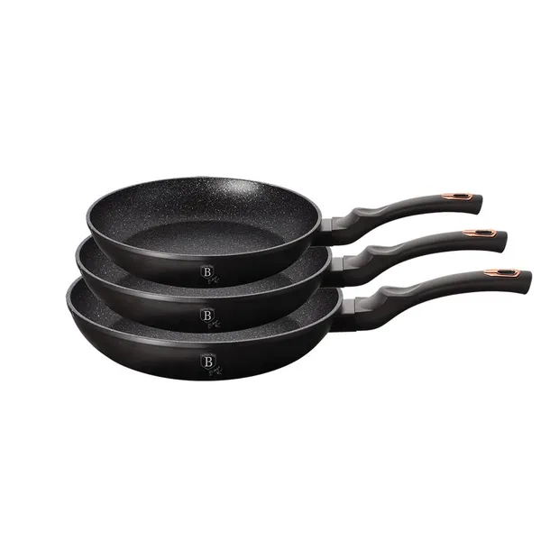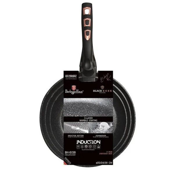 Zestaw 3 patelni granitowych 20 / 24 / 28cm BERLINGER HAUS z serii BLACK ROSE COLLECTIONGarnki i akcesoria z serii BLACK ROSE firmy BERLINGER HAUS wykonane są z wysokiej klasy kutego aluminium pokrytego wewnątrz potrójną powłoką granitową (marble) o bardzo wysokim współczynniku twardości. Powłoka zewnętrzna występuje w kilku wersjach kolorystycznych o charakterystycznym metalicznym połysku. Te atrakcyjne i modne naczynia wyposażone są standardowo w uchwyty typu SOFT TOUCH (silikon handle). Przystosowane do wszystkich rodzajów kuchenek: gazowa, elektryczna, ceramiczna, halogenowa, indukcyjna. System TURBO INDUCTION (bardzo szybko nagrzewają się) pozwala zaoszczędzić nawet 35% energii.
