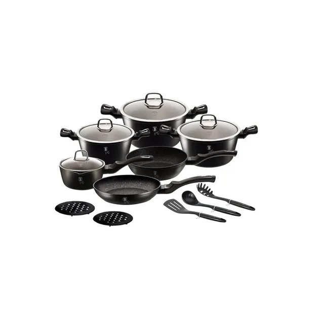 15-elementowy zestaw garnków BERLINGER HAUS z serii BLACK SILVER Garnki firmy BERLINGER HAUS wykonane są z wysokiej klasy kutego aluminium pokrytego wewnątrz potrójną powłoką granitową (marble) o bardzo wysokim współczynniku twardości. Te atrakcyjne i modne naczynia wyposażone są standardowo w uchwyty typu SOFT TOUCH (silikon handle). Przystosowane do wszystkich rodzajów kuchenek: gazowa, elektryczna, ceramiczna, halogenowa, indukcyjna. System TURBO INDUCTION (bardzo szybko nagrzewają się) pozwala zaoszczędzić nawet 35% energii. W skład zestawu wchodzą:
