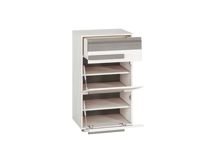 Szafka na buty do przedpokoju posiada u góry szufladę na drobiazgi oraz dwoje uchylnych drzwiczek pozwalających na łatwe i szybkie otwieranie.