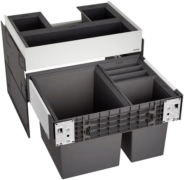 To, co było dobre, teraz stało się jeszcze lepsze. Dzięki BLANCO SELECT II przestrzeń pod zlewozmywakiem staje się idealnie dostosowana do potrzeb użytkowników. BLANCO SELECT II łączy w sobie wszystkie zalety praktycznego i higienicznego systemu segregacji odpadków. Możliwość dopasowania do każdej szafki, opcja dowolnej konfiguracji koszy różnej wielkości i umieszczenia wysuwanej szuflady organizacyjnej, a także prosty montaż bez nawiercania zapewniają optymalne wykorzystanie przestrzeni pod zlewozmywakiem i ułatwiają sortowanie domowych odpadów. Nakładana pokrywka z filtrem węglowym zapobiega wydostawaniu się zapachom z kosza bio.