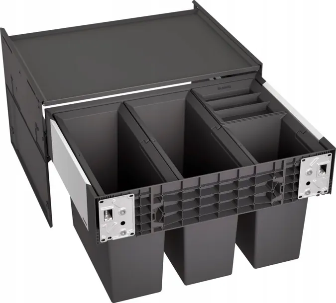 Nie ma potrzeby optycznego ukrywania systemów segregacji odpadów. Ciemne tworzywo sztuczne w połączeniu z aluminiowymi elementami zapewnia stylowy, nowoczesny wygląd.
