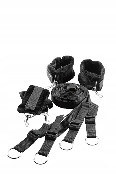 Zestaw ograniczający łóżko z mankietami na nadgarstek i kostkę. Po prostu wsuń paski pod spód materaca albo z góry na dół lub z boku na bok, aby dostosować grę w wiązanie. Paski można dopasować do wielkości łóżka za pomocą plastikowych klamer. Mankiety wykonane są ze sztucznego futra, miękkie i puszyste, wygodne w noszeniu, zapinane na rzepy. Mankiety mocowane są do O-ringów pasów łóżkowych za pomocą wygodnych haczyków z muszkietu. Zestaw ograniczający jest doskonałym narzędziem BDSM, ale należy go używać ostrożnie i nigdy nie pozostawiać związanej osoby bez opieki.