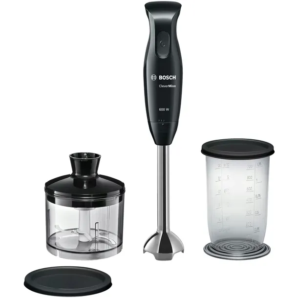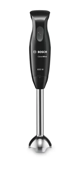 Bosch MSM2620B CleverMixx to solidny blender ręczny o mocy 600 W, dzięki któremu w mgnieniu oka przygotujesz zupy kremy, koktajle czy sosy. Jego czarny, transparentny design i ergonomiczna konstrukcja sprawiają, że jest wygodny w użyciu i łatwy do przechowania.
