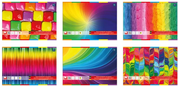- szkolny blok rysunkowy z kolorowymi kartkami