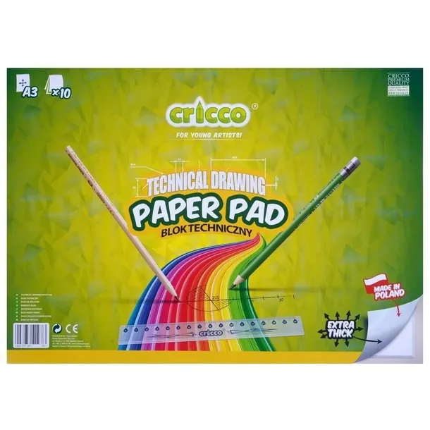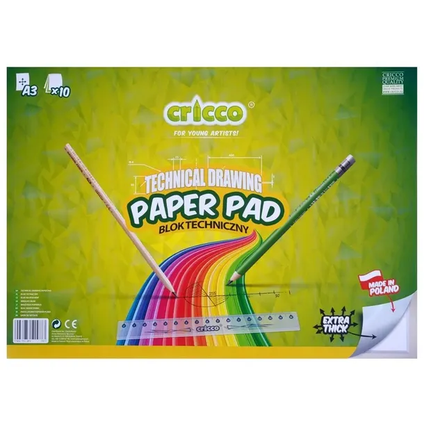 Blok techniczny Cricco w formacie A3 z papierem w kolorze białym. 10 arkuszy jednostronnie klejonych o gramaturze 170 g. Doskonały do wszelkich wyzwań młodych artystów. Wyprodukowane w Polsce.