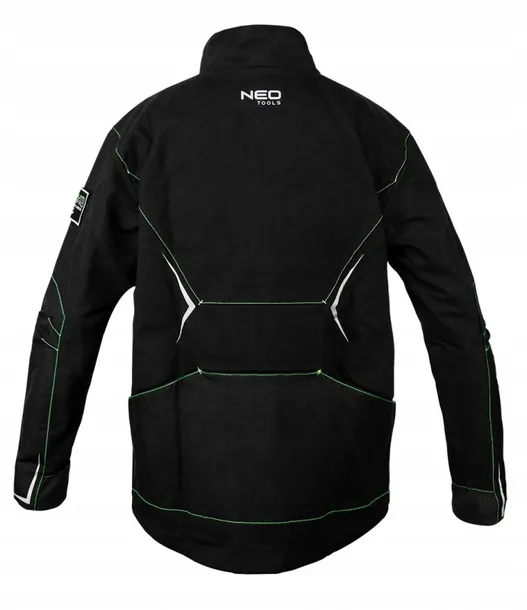 ✔️ Bluza robocza Premium PRO, rozmiar S, 81-214-S marki NEO wykonana została z tkaniny głównej, czyli 100% bawełny Canvas o gramaturze 425 g/m2 oraz wzmocniona materiałem Cordura NYCO 75% bawełna, 25% nylon, 272 g/m2 na barkach, plecach, rękawach i kieszeniach. Bluza ma kolor czarny z dodatkiem kontrastowej, neonowo-zielonej barwy. Wyposażona w elastyczną podszewkę z siatki, zamki YKK i odblaskowe nadruki 3M. Posiada 12 kieszeni: 2 piersiowe zapinane na zamek, 6 zapinanych na zatrzaski magnetyczne, 2 typu kangur oraz 2 dodatkowe w dolnej części bluzy. Zamek główny YKK odzieży został przykryty praktyczną plisą. Wydłużony tył bluzy roboczej, a także elastyczny pas wszyty wewnątrz z zamkiem umożliwia połączenie jej ze spodniami z serii w kombinezon. Dół rękawów wykończony został ribem od wewnętrznej strony. Na profilowanym rękawie umieszczono również dodatkową naszywkę na rzep pozwalającą na doczepienie własnego logo. Wszywka identyfikacyjna ułatwia z kolei identyfikację w miejscu pracy. Marka NEO polecana jest profesjonalistom i majsterkowiczom.