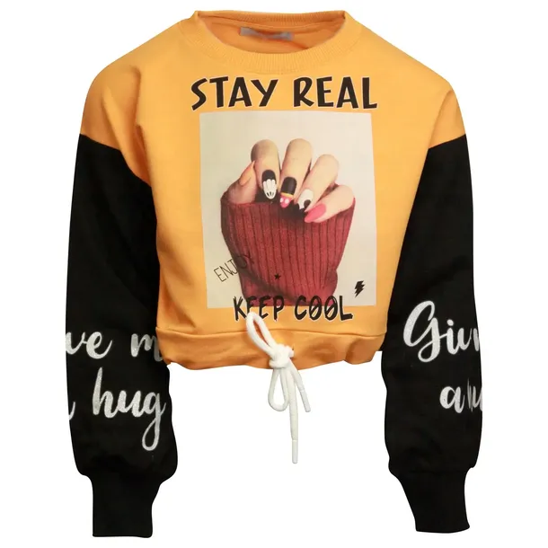 Świetna krótka bluza w kolorze pomarańczowym z nadrukiem efektownej dłoni z pazurkami. Czarne rękawy bluzy zdobione brokatowymi napisami. Bluzę można ściągnąć na dole dzięki wszytemu sznurkowi i dopasować indywidualnie.