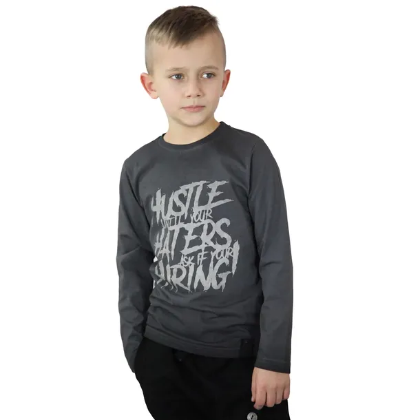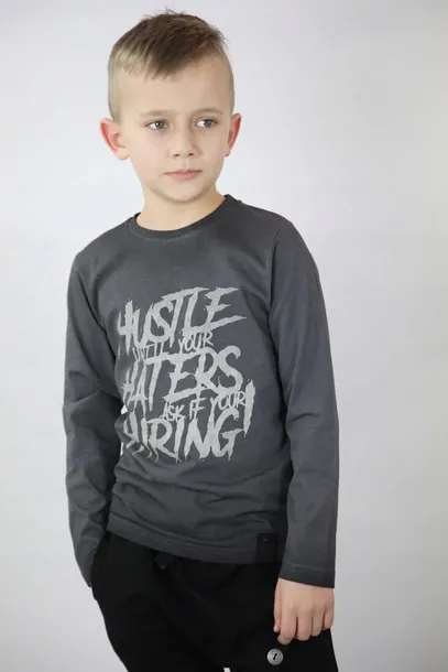 Świetna, dekatyzowana bluzeczka w kolorze ciemnej szarości. Posiada nadruk w postaci napisów. Idealnie sprawdzi się w porze zimowej czy w letnie, chłodniejsze wieczory.