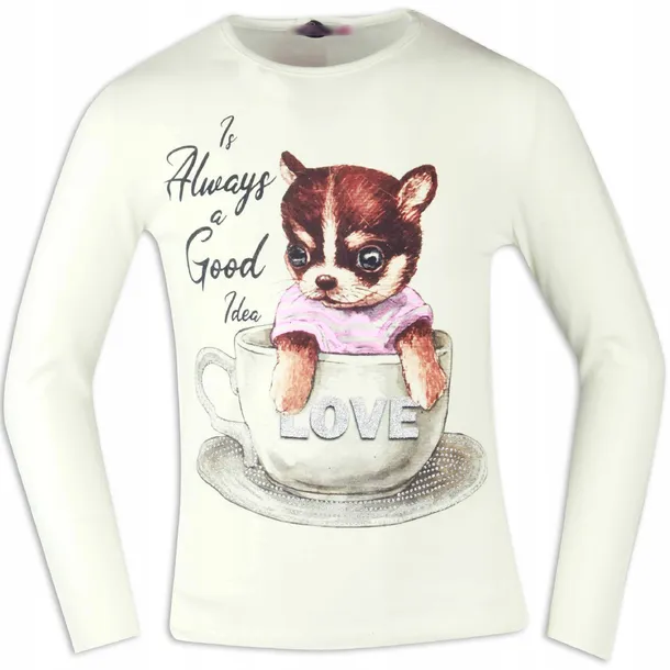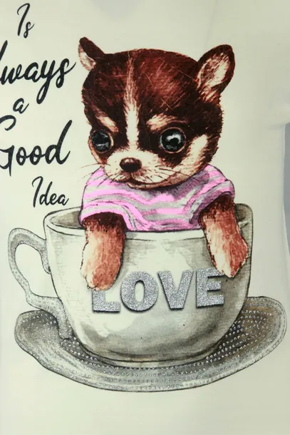Świetna bluzeczka o zabawnym nadruku słodkiego pieska siedzącego w filiżance. Napis na naczyniu, jego ucho oraz spodek są ozdobione brokatem, który ładnie mieni się w świetle. Idealnie sprawdzi się w porze zimowej czy w letnie, chłodniejsze wieczory.