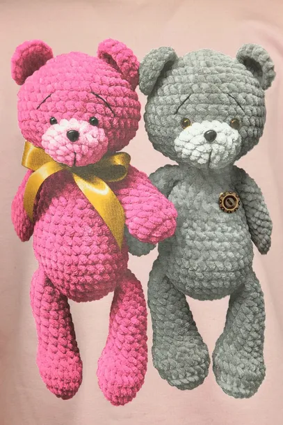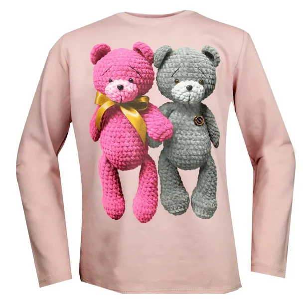 Świetna bluzeczka w kolorze różowym o bardzo realistycznym nadruku słodkich misiów. Na jednym z nich guziczek 3D. Tył lekko dłuższy. Idealnie sprawdzi się w porze zimowej czy w letnie, chłodniejsze wieczory.