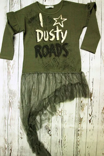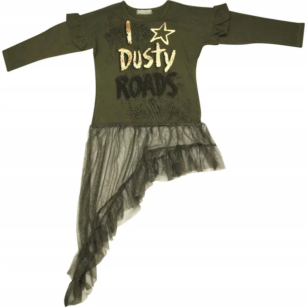 Świetna bluzka w kolorze pięknej zieleni z nadrukiem w postaci efektownego napisu oraz gwiazdy. Rękawki posiadają falbankę, natomiast dół bluzki wykończony jest błyszczącym tiulem. Idealnie sprawdzi się w porze zimowej czy w letnie, chłodniejsze wieczory.