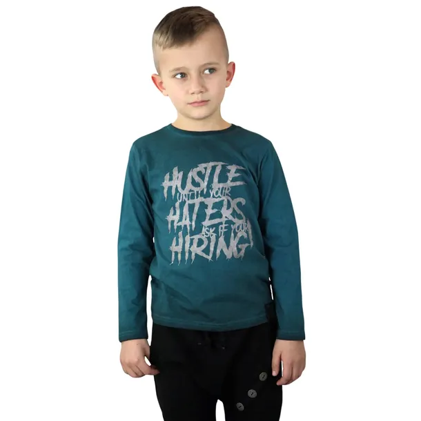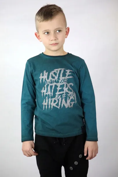 Świetna, dekatyzowana bluzeczka w kolorze ciemnego turkusu. Posiada nadruk w postaci napisów. Idealnie sprawdzi się w porze zimowej czy w letnie, chłodniejsze wieczory.