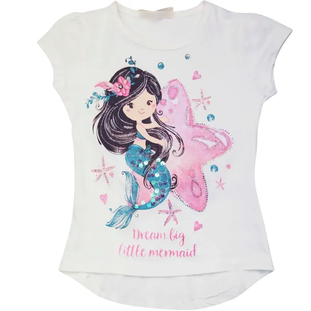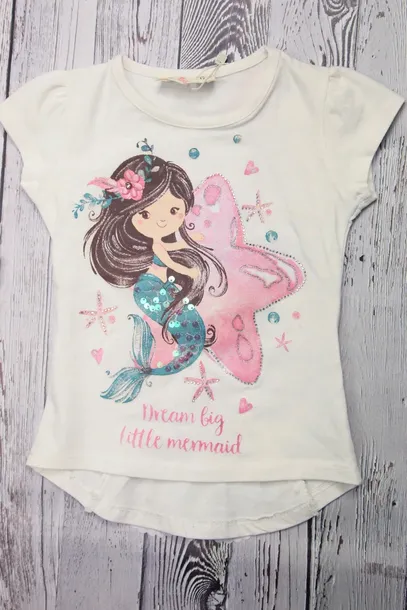 Bluzka w pięknym kolorze ecru z uroczym nadrukiem. Nadruk został miejscami pokryty cekinami oraz dżetami, które pięknie odbijają światło. Tył lekko dłuższy. Z tyłu efektowna wstawka z koronki w towarzystwie kokardki. Idealnie sprawdzi się w porze zimowej i letniej ze względu na krótki rękawek.