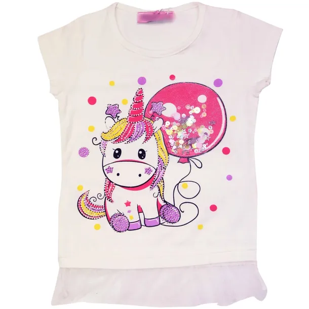 Piękna bluzka w kolorze ecru z uroczym nadrukiem jednorożca z balonikiem, który posiada cekiny i dżety przemieszczające się- bardzo efektowne, pięknie odbijają światło. Dół bluzeczki lekko przedłużony tiulem. Idealnie sprawdzi się w porze zimowej i letniej ze względu na krótki rękawek.