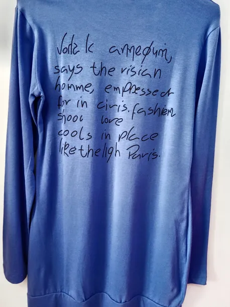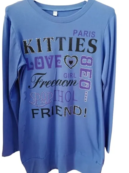 Modna urocza bluzeczka w fioletowym kolorze z napisami i dżetami , długi rękaw , napisy tył i przód.