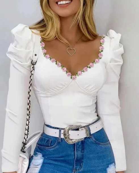 1✔️Stylowy haftowany detal kwiatowy przy dekolcie dodający uroku.