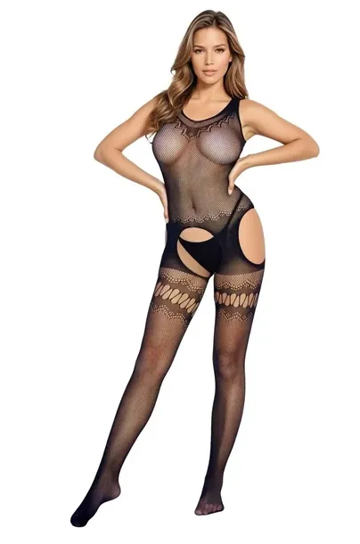Wykonany z drobnej siateczki z dekoracyjnymi wzorami na udach i dekolcie, które dodają mu elegancji.