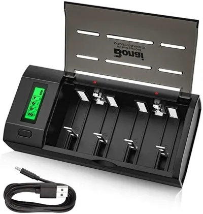 Wielofunkcyjny: Ta ładowarka nie może ładować baterii 1,5 V, zwykłych baterii, baterii jednorazowych ani jednorazowych baterii alkalicznych. Dzięki niezależnemu gnieździe ładowania może losowo ładować do 4 akumulatorów 1,2VCD AA AAA lub 2 akumulatory 9V Ni-MH/Ni-CD w tym samym czasie. Ładowanie TYLKO jednej baterii nie stanowi problemu.