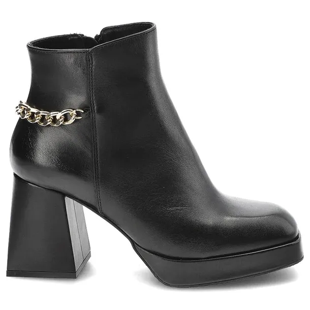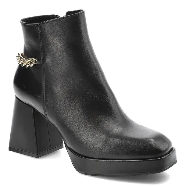 Botki damskie Simen, cholewka z gładkiej skóry naturalnej z wysoką cholewką i dekoracyjnym łańcuchem przy kostce stabilny obcas oraz gruba podeszwa, czarne, 5645A