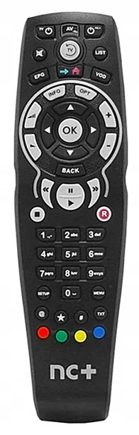 Oryginalny pilot NC+ do dekoderów typu nBox, nBox Recorder, mediaBox. Pilot uniwersalny umożliwia jednoczesną obsługę dekodera platformy NC+ oraz telewizora - włączanie i wyłączanie telewizora, wybór wejścia AV, podgłaśnianie/ściszanie telewizora.Bardzo łatwe programowanie wystarczy kilka sekund!Oprogramowanie pilota obsługuje telewizory marek: Grundig, LG, Panasonic, Loewe, Philips, Samsung, Sharp, JVC, Sony, Thomson, Toshiba i inne.
