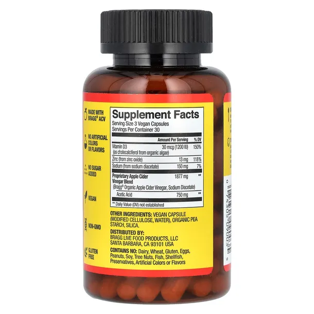 Wyprodukowana z użyciem octu jabłkowego Bragg, każda kapsułka zawiera 100 lat mądrości. Teraz możesz czerpać korzyści z naszego oryginalnego ACV oraz dodatkowe korzyści zdrowotne witaminy D i cynku na układ odpornościowy.