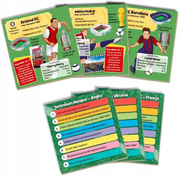 Wspólna zabawa - wspólna nauka zapamiętywania! Ile szczegółów uda Ci się zapamiętać w ciągu 10 sekund? Razem z rodziną i przyjaciółmi podejmij wyzwanie, któremu sprostają tylko najlepsi! Sprawdź swoją wiedzę o najważniejszych klubach piłkarskich i zawodnikach, wykazując się niebywałym zmysłem obserwacji, pamięcią i spostrzegawczością. BrainBox - Piłka nożna to nie lada wyzwanie dla wszystkich fanów futbolu. Na 55 kartach znajdziesz 440 pytań dotyczących słynnych klubów piłkarskich i najpopularniejszych piłkarzy z całego świata. Za pomocą wspaniałych ilustracji i zabawnych ciekawostek, gra przybliża sylwetki najznamienitszych zawodników z najwyższych europejskich lig, drużyn z Ameryki Południowej, a nawet dalszych zakątków globu. Na czym to polega? Weź kartę z pudełka i odwróć klepsydrę. Przyglądaj się obrazkowi na karcie tak długo, jak przesypuje się piasek. Możesz przekręcić klepsydrę jeszcze raz, jeśli potrzebujesz więcej ż kartę innemu graczowi i rzuć kością. Liczba na kości wskazuje, na które pytanie musisz odpowiedzieć (na przykład gdy wyrzucisz 2, odpowiadasz na pytanie numer 2).Gracz, któremu została przekazana karta, czyta na głos pytanie, na które musisz udzielić odpowiedzi. Następnie sprawdza Twoją odpowiedź, patrząc na obrazek na drugiej stronie śli odpowiedź jest prawidłowa, zatrzymaj kartę. Jeśli jest błędna, odłóż kartę do pudełka. Teraz kolej na następnego , który zgromadzi najwięcej kart po upływie 10 minut, wygrywa! Dlaczego pokochasz tę grę? To prawdziwa gratka dla wszystkich fanów futbolu! Gra pełna jest ciekawostek o najpopularniejszych klubach i z serii BrainBox stanowią doskonałe ćwiczenie pamięci!BrainBoxy są dostosowane do wspólnej zabawy dzieci i dorosłych, by była ona satysfakcjonująca dla obu powstają w etycznych warunkach, z materiałów pochodzących z recyklingu i zdatnych do ponownego przetworzenia.