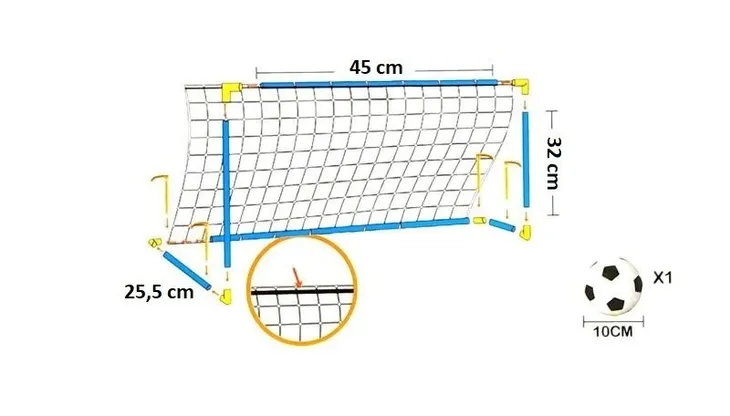 W zestawie znajdują się wszystkie elementy potrzebne do montażu bramek. Dodatkowo znajdziemy tu dwie piłki do gry oraz dwie pompki.