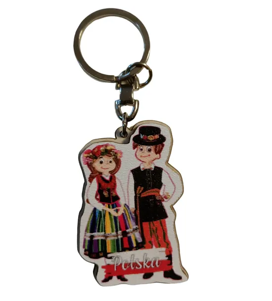 Brelok drewniany z parą w strojach regionalnych z Łowicza. Ozdoba kluczy do domu, samochodu i pracy, z takim breloczkiem klucze zawsze się znajdą.