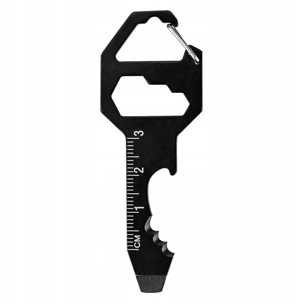 Brelok marki NEO to mini narzędzie z 6 funkcjami: klucz sześciokątny, linijka, śrubokręt płaski, otwieracz do butelek, nożyk.