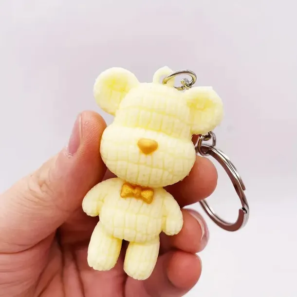 Ozdobny brelok w kształcie żółtego misia. Elementy metalowe w kolorze srebrnym. Breloczek posiada oczko do przypięcia kluczy i zapięcie dzięki czemu może służyć jako ozdobna przywieszka do plecaka lub torby. Idealnie nadaje się również jako upominek dla bliskiej osoby.