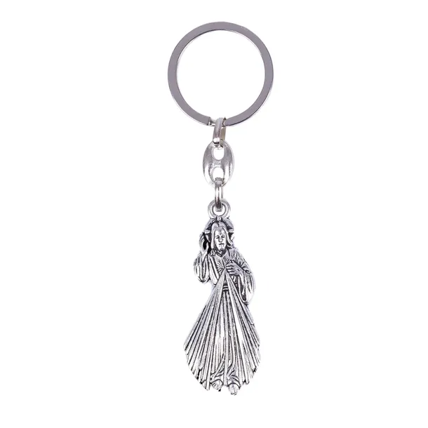 Metalowy brelok do kluczy z wizerunkiem Jezusa Miłosiernego w kolorze srebrnym satynowym. Breloczek posiada oczko do zaczepienia. Jest lekki i wytrzymały. Niepowtarzalny jako przywieszka do kluczy, plecaka czy upominek dla bliskiej osoby.
