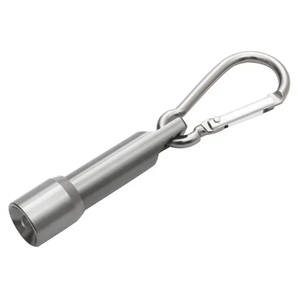 Brelok latarka LED z karabińczykiem. Zasilana 4 bateriami AG3 (dołączone do produktu). Pakowana w czarne opakowanie upominkowe.