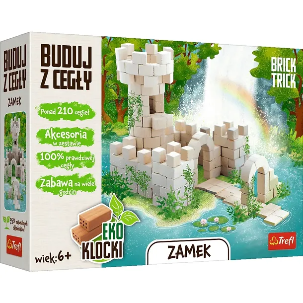 Wybuduj przepiękny Zamek niedaleko wodospadu, wykorzystując prawdziwe białe cegły i elementy dekoracyjne jak trawę czy krzew. Skorzystaj z dołączonych planów budowy lub użyj wyobraźni do stworzenia niepowtarzalnej konstrukcji. To nie koniec zabawy! Rozpuść konstrukcję w wodzie i buduj dalej, wykorzystując ponownie te same cegły! W opakowaniu znajdziesz: prawdziwe cegły, klej, elementy dekoracyjne, podstawkę, naklejkę i instrukcję. Dbamy o środowisko, dlatego zestaw zawiera aż 95% naturalnych składników! EKO klocki = zabawa murowana!