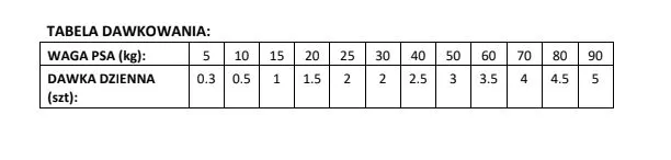 Ze względu na wysoką smakowitość należy stosować się do zaleceń dziennego dawkowania i codziennie ćwiczyć z psem.Waga psa (kg): | 5 | 10 | 15 | 20 | 25-30 | 40 | 50 | 60 | 70 | 80 | 90Dawka dzienna (szt.): | 0.3 | 0.5 | 1 | 1.5 | 2 | 2.5 | 3 | 3.5 | 4 | 4.5 | 5