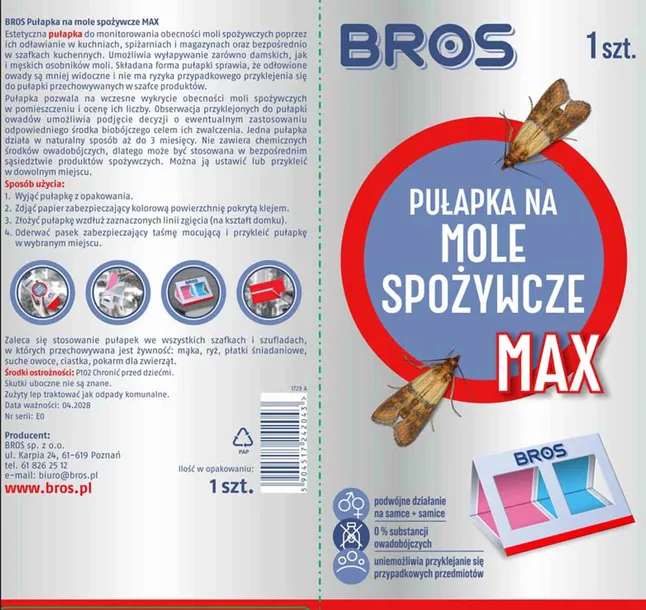 **BROS PUŁAPKA NA MOLE SPOŻYWCZE MAX - na samce i samice 1 sztuka** BROS Pułapka na Mole Spożywcze MAX to estetyczna i skuteczna pułapka przeznaczona do monitorowania i wyłapywania moli spożywczych zarówno samców, jak i samic w kuchniach, spiżarniach, magazynach oraz bezpośrednio w szafkach kuchennych. Składana forma pułapki sprawia, że odłowione owady są mniej widoczne, a ryzyko przypadkowego przyklejenia się do pułapki przechowywanych produktów jest minimalne. Dodatkowo, dzięki zastosowaniu feromonu, pułapka skutecznie wabi mole spożywcze, co pozwala na wczesne wykrycie ich obecności i ocenę liczby. Główne Cechy: ✅ Skuteczność w Wyłapywaniu: Pułapka jest podwójnie skuteczna, wabiąc zarówno samice, jak i samców moli spożywczych, co pozwala na skuteczną kontrolę populacji szkodników. ✅ Feromonowa Wabik: Dodatek feromonu w pułapce skutecznie wabi mole spożywcze, umożliwiając ich wyłapywanie oraz wczesne wykrycie obecności w pomieszczeniu. ✅ Długotrwałe Działanie: Czas działania feromonu wynosi około 3 miesiące, podczas gdy klej na pułapce pozostaje skuteczny znacznie dłużej. ✅ Bezpieczna dla Żywności: Pułapka nie zawiera chemicznych środków owadobójczych, co pozwala na jej bezpieczne stosowanie w pobliżu żywności, takiej jak mąka, kasza, makarony, płatki, kawa, herbata, kakao, suszone owoce. ✅ Estetyczna Forma: Składana konstrukcja na kształt domku sprawia, że odłowione owady są mniej widoczne, co zwiększa estetykę i funkcjonalność pułapki. Sposób Użycia: ➡️ Krok 1: Wyjąć lep z opakowania. ➡️ Krok 2: Zdjąć papier zabezpieczający kolorową powierzchnię pokrytą klejem. ➡️ Krok 3: Złożyć pułapkę wzdłuż zaznaczonych linii zgięcia, tworząc kształt domku. ➡️ Krok 4: Oderwać pasek zabezpieczający taśmę mocującą i przykleić pułapkę w wybranym miejscu. ➡️ Krok 5: Zaleca się stosowanie pułapek we wszystkich szafkach i szufladach, w których przechowywana jest żywność, aby zapewnić maksymalną skuteczność. Dla Kogo Jest Ten Produkt: BROS Pułapka na Mole Spożywcze MAX jest idealnym rozwiązaniem dla: - Właścicieli Domów i Mieszkań: Osoby chcące skutecznie zwalczać mole spożywcze w swoich kuchniach, spiżarniach i szafkach kuchennych. - Magazynów i Sklepów Spożywczych: Firmy potrzebujące monitorować i kontrolować populację moli spożywczych w miejscach przechowywania żywności. - Osób Dbających o Higienę i Bezpieczeństwo Żywności: Każdy, kto chce utrzymać swoje pomieszczenia wolne od moli spożywczych, zapewniając jednocześnie bezpieczeństwo przechowywanej żywności. BROS Pułapka na Mole Spożywcze MAX to niezawodne narzędzie do monitorowania i kontrolowania populacji moli spożywczych. Dzięki skutecznej formule feromonowej, estetycznej konstrukcji i bezpiecznemu składowi, jest to idealne rozwiązanie dla każdego, kto chce utrzymać swoje kuchnie i spiżarnie wolne od tych uciążliwych szkodników.