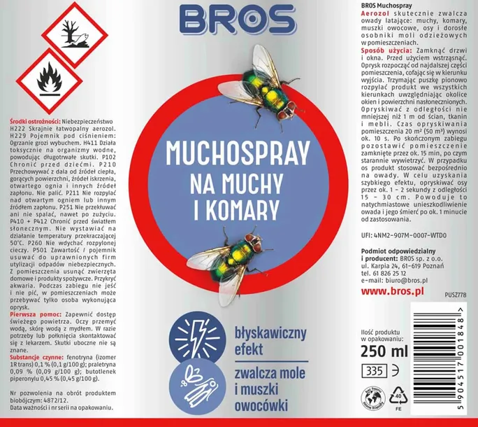 **BROS MUCHOSPRAY 250 ml - do zwalczania owadów latających i biegających** BROS Muchospray to skuteczny aerozol przeznaczony do zwalczania owadów latających i biegających w pomieszczeniach. Dzięki nowoczesnym substancjom aktywnym, preparat zapewnia zarówno błyskawiczne działanie (efekt 'knock-down'), jak i skuteczność w przypadku owadów uodpornionych na dotychczas stosowane środki. Główne Cechy: ✅ Skuteczność Przeciw Owadom Latającym: Aerozol skutecznie zwalcza muchy, komary, muszki owocowe, osy oraz dorosłe osobniki moli odzieżowych. ✅ Skuteczność Przeciw Owadom Biegającym: Preparat działa również na owady biegające, zapewniając kompleksową ochronę pomieszczeń. ✅ Błyskawiczne Działanie: Nowoczesne substancje aktywne zapewniają natychmiastowy efekt 'knock-down', skutecznie eliminując owady. ✅ Działanie na Uodpornione Owady: Skuteczność preparatu tam, gdzie owady uodporniły się na dotychczas stosowane środki. Sposób Użycia: ➡️ Krok 1: Zamknąć drzwi i okna. ➡️ Krok 2: Przed użyciem wstrząsnąć puszką. ➡️ Krok 3: Rozpocząć oprysk od najdalszej części pomieszczenia, cofając się w kierunku wyjścia. ➡️ Krok 4: Trzymając puszkę pionowo, rozpylać produkt we wszystkich kierunkach, uwzględniając okolice okien i powierzchni nasłonecznionych. ➡️ Krok 5: Opryskiwać z odległości nie mniejszej niż 1 m od ścian, tkanin i mebli. ➡️ Czas Opryskiwania: Czas opryskiwania pomieszczenia o powierzchni 20 m² (50 m³) wynosi około 10 sekund. ➡️ Po Zabiegu: Po skończonym zabiegu pozostawić pomieszczenie zamknięte przez około 15 minut, po czym starannie wywietrzyć. ➡️ Stosowanie na Osy: W przypadku os, stosować produkt bezpośrednio na owady. Powoduje to natychmiastowe unieszkodliwienie owada i jego śmierć po około 1 minucie od zastosowania. Dla Kogo Jest Ten Produkt: BROS Muchospray jest idealnym rozwiązaniem dla: - Właścicieli Domów i Mieszkań: Osoby, które chcą skutecznie zwalczać owady latające i biegające w swoich domach. - Biur i Przedsiębiorstw: Miejsca pracy, gdzie obecność owadów może stanowić problem i wpływać na komfort pracowników. - Restauracji i Kuchni: Miejsca, gdzie higiena jest kluczowa, a obecność owadów niepożądana. - Magazynów i Sklepów: Przestrzenie magazynowe i handlowe, które wymagają skutecznej ochrony przed owadami. BROS Muchospray to niezawodne narzędzie do zwalczania owadów latających i biegających. Dzięki nowoczesnym substancjom aktywnym, skuteczności wobec uodpornionych owadów oraz łatwości użycia, jest to idealny produkt dla każdego, kto chce utrzymać swoje pomieszczenia wolne od owadów. ❗️ UWAGA H222 Skrajnie łatwopalny aerozol. H229 Pojemnik pod ciśnieniem: Ogrzanie grozi wybuchem. H411 Działa toksycznie na organizmy wodne, powodując długotrwałe skutki. ❗️ Produktów biobójczych należy używać z zachowaniem środków ostrożności. Przed każdym użyciem należy przeczytać etykietę i informacje dotyczące produktu. ❗️ Przed każdym użyciem należy przeczytać etykietę i informacje dotyczące produktu. Pełna treść sposobu użycia znajduje się na opakowaniu. Należy przeczytać instrukcję użycia produktu z opakowania przed jego zastosowaniem. Zwróć uwagę na zwroty wskazujące na rodzaj zagrożenia oraz przestrzegaj zalecanych środków bezpieczeństwa.