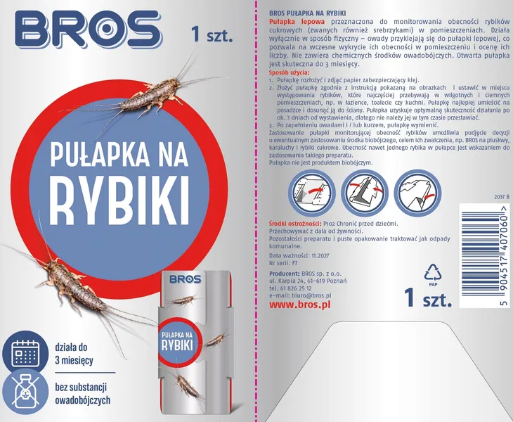 Pułapka lepowa przeznaczona do monitorowania obecności rybików cukrowych (zwanych również srebrzykami) w pomieszczeniach. Działa wyłącznie w sposób fizyczny – owady przyklejają się do pułapki lepowej, co pozwala na wczesne wykrycie ich obecności w pomieszczeniu i ocenę ich liczby. Nie zawiera chemicznych środków owadobójczych. Otwarta pułapka jest skuteczna do 3 miesięcy.