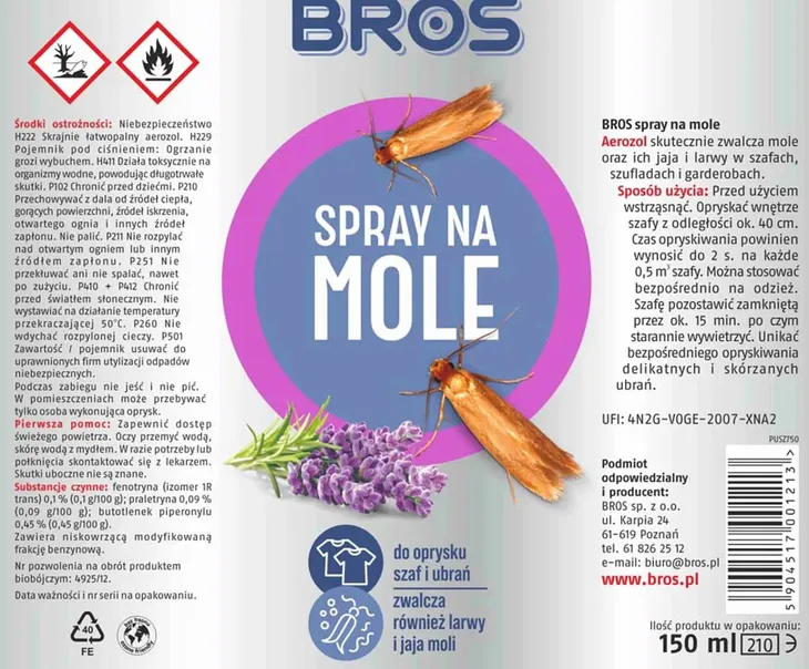 **BROS SPRAY NA MOLE 150 ml** BROS Spray na Mole – 150 ml Opis produktu: BROS Spray na Mole to skuteczny aerozol przeznaczony do zwalczania moli oraz ich jaj i larw. Produkt chroni szafy, ubrania oraz wnętrza garderób przed działaniem tych szkodników. Dzięki specjalnej formule spray zapewnia pełną ochronę, eliminując mole i ich rozwój w miejscach, gdzie przechowywane są ubrania. Dodatkowo, spray zawiera składniki o działaniu ochronnym, co pozwala zabezpieczyć tkaniny przed kolejną inwazją. Produkt ma subtelny zapach i jest łatwy w aplikacji. Dzięki precyzyjnemu rozpylaczowi dociera nawet do trudno dostępnych miejsc, skutecznie chroniąc całą przestrzeń. Główne cechy i zalety produktu: ✅ Skuteczna ochrona: Eliminuje mole, ich jaja oraz larwy, skutecznie zabezpieczając ubrania i tkaniny w szafach i garderobach. ✅ Wielozadaniowość: Możliwość stosowania bezpośrednio na odzież, co zapewnia dodatkową ochronę tkanin. ✅ Łatwa aplikacja: Aerozol umożliwia precyzyjne opryskanie wnętrz szaf, szuflad i innych miejsc przechowywania ubrań. ✅ Długotrwały efekt: Chroni przed molami przez długi czas, zabezpieczając ubrania przed kolejną inwazją. ✅ Przyjemny zapach: Formuła wzbogacona o delikatną nutę zapachową, dzięki czemu nie pozostawia nieprzyjemnej woni na ubraniach. Specyfikacja produktu: ☑️ Rodzaj produktu: Aerozol do zwalczania moli ubraniowych ☑️ Pojemność: 150 ml ☑️ Substancje czynne: •Fenotryna (izomer 1R trans) – 0,1% (0,1 g/100 g) •Praletryna – 0,09% (0,09 g/100 g) •Butotlenek piperonylu – 0,45% (0,45 g/100 g) ☑️ Działanie: Zwalczanie moli, jaj i larw w szafach, garderobach i na odzieży ☑️ Producent: BROS Sp. z o.o. Jak stosować produkt? ➡️ Przygotowanie: Wstrząśnij pojemnikiem przed użyciem. ➡️ Sposób aplikacji: 1.Opryskaj wnętrza szaf i garderób z odległości ok. 40 cm. 2.Czas opryskiwania powinien wynosić ok. 2 sekundy na każde 0,5 m³ szafy. 3.W przypadku bezpośredniego stosowania na odzież spryskaj delikatnie materiał, unikając tkanin skórzanych i bardzo delikatnych. ➡️ Po aplikacji: •Zamknij szafę na 15 minut, a następnie dokładnie ją wywietrz. •Umyj ręce po użyciu preparatu. ➡️ Częstotliwość stosowania: W razie potrzeby powtarzaj zabieg, aby w pełni wyeliminować szkodniki. Dla kogo jest ten produkt? ➡️ Dla osób chcących chronić swoje ubrania: Doskonały do domów, w których mole stanowią problem. ➡️ Dla właścicieli garderób i szaf: Idealny do stosowania w miejscach przechowywania odzieży, takich jak szafy, szuflady czy pawlacze. ➡️ Dla osób, które chcą zabezpieczyć swoje ubrania na długi czas: Skuteczna ochrona przed molami, jajami i larwami, co zapobiega ich ponownemu pojawieniu się. Dlaczego warto wybrać BROS Spray na Mole? BROS Spray na Mole to niezawodne rozwiązanie w walce z molami. Skutecznie likwiduje owady i ich larwy, jednocześnie zapewniając długotrwałą ochronę. Łatwa aplikacja oraz możliwość stosowania na odzież sprawiają, że jest to idealny wybór dla osób, które cenią sobie skuteczność i wygodę użytkowania. **UWAGA!** - Produktów biobójczych należy używać z zachowaniem środków ostrożności. - Przed każdym użyciem należy przeczytać etykietę i informacje dotyczące produktu.