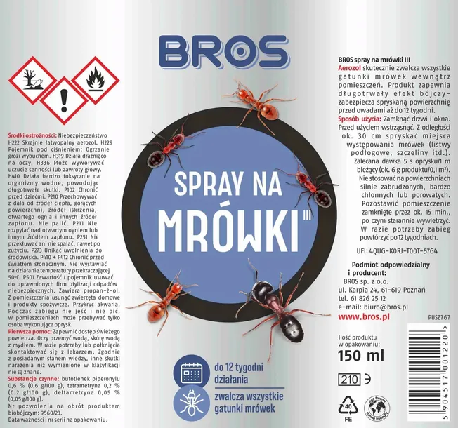 **BROS SPRAY NA MRÓWKI 150 ml** Opis produktu BROS Spray na mrówki to skuteczny środek owadobójczy, który pozwala na szybkie i efektywne zwalczanie wszystkich gatunków mrówek w pomieszczeniach. Produkt oparty na formule aerozolowej jest łatwy w użyciu, a jego działanie utrzymuje się do 12 tygodni, zapewniając długotrwałą ochronę przed insektami. Spray jest idealny do zwalczania mrówek w trudno dostępnych miejscach, takich jak szczeliny, listwy przypodłogowe czy inne zakamarki, w których gromadzą się owady. Preparat działa natychmiast po zastosowaniu, eliminując zarówno mrówki, jak i ich ścieżki zapachowe, co zapobiega ponownemu pojawieniu się insektów w tych samych miejscach. Dzięki precyzyjnemu rozpylaniu można skutecznie pokryć obszary narażone na inwazję owadów, jednocześnie minimalizując ryzyko rozprzestrzeniania się chemii w otoczeniu. Główne cechy i zalety ✅ Długotrwała ochrona – skuteczność preparatu utrzymuje się nawet do 12 tygodni po aplikacji, dzięki czemu nie ma potrzeby częstego stosowania. ✅ Szybkie działanie – aerozol zapewnia natychmiastową eliminację mrówek zaraz po rozpylaniu. ✅ Wygodny w użyciu – łatwość aplikacji dzięki formie aerozolu, który pozwala na precyzyjne spryskanie wybranych powierzchni. ✅ Uniwersalność – skuteczny wobec wszystkich gatunków mrówek, co czyni go uniwersalnym rozwiązaniem do walki z insektami. ✅ Bezpieczeństwo użytkowania – wyposażony w jasne instrukcje dotyczące stosowania i przechowywania, aby minimalizować ryzyko niewłaściwego użycia. ✅ Idealny do różnych powierzchni – można stosować na listwach przypodłogowych, w szczelinach, wokół drzwi i okien oraz na innych problematycznych powierzchniach. Specyfikacja produktu ☑️ Rodzaj produktu: Aerozol owadobójczy na mrówki ☑️ Pojemność: 150 ml ☑️ Substancje czynne: permetryna 0,6%, tetrametryna 0,2% ☑️ Forma działania: Bezpośrednie zwalczanie owadów oraz ich ścieżek zapachowych ☑️ Czas działania: Do 12 tygodni ochrony po zastosowaniu ☑️ Przeznaczenie: Do użytku wewnątrz pomieszczeń ☑️ Producent: BROS Sp. z o.o. ☑️ Wymagania dotyczące przechowywania: Trzymać z dala od źródeł ognia i ciepła ☑️ Bezpieczeństwo: Chronić przed dziećmi; zgodny z normami bezpieczeństwa dla chemikaliów Jak stosować produkt ➡️ Zamknąć drzwi i okna w pomieszczeniu przed aplikacją. ➡️ Przed użyciem wstrząsnąć pojemnikiem w celu równomiernego rozprowadzenia substancji czynnych. ➡️ Spryskać miejsca występowania mrówek, takie jak szczeliny, listwy przypodłogowe, ścieżki owadów, z odległości około 30 cm. ➡️ Zalecana dawka to około 5 sekund rozpylania na 1 m² (6 g produktu). ➡️ Unikać stosowania na bardzo zabrudzone lub porowate powierzchnie. ➡️ Po aplikacji pozostawić pomieszczenie zamknięte na 15 minut, a następnie dokładnie przewietrzyć. ➡️ W razie potrzeby powtórzyć zabieg po 2 tygodniach. Dla kogo jest ten produkt? BROS Spray na mrówki to idealne rozwiązanie dla: ➡️ Osób borykających się z problemem mrówek w domu lub innych pomieszczeniach zamkniętych. ➡️ Właścicieli mieszkań i domów, którzy chcą szybko i skutecznie pozbyć się insektów bez konieczności wzywania specjalistów. ➡️ Rodzin z dziećmi, które szukają środków o przedłużonym działaniu, aby rzadziej przeprowadzać zabiegi zwalczania owadów. ➡️ Osób dbających o higienę i porządek w miejscach, gdzie żywność lub inne produkty mogą przyciągać owady. ➡️ Właścicieli firm, którzy chcą zadbać o czystość i bezpieczeństwo w pomieszczeniach użyteczności publicznej, takich jak biura czy magazyny. BROS Spray na mrówki to niezawodne narzędzie w walce z inwazją owadów, które gwarantuje długotrwałą ochronę oraz łatwość stosowania. Skuteczność, bezpieczeństwo i uniwersalność sprawiają, że jest to produkt niezbędny w każdym domu. **UWAGA!** - Produktów biobójczych należy używać z zachowaniem środków ostrożności. - Przed każdym użyciem należy przeczytać etykietę i informacje dotyczące produktu.